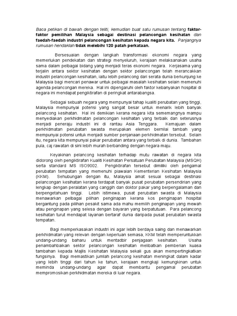 Setakat ini beberapa kemudahan untuk para pelancong kesihatan telah dilaksanakan. Boleh disalin terus dari petikan tinggalkan huraian contoh 3. Karangan ini ditulis sebagai kerja rumah yang diberikan oleh guru saya sepanjang bergelar seorang murid sekolah menengah tingkatan 4.