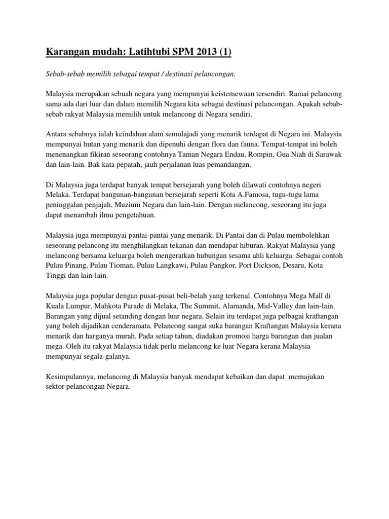 Malaysia ialah masyarakat hendaklah memilih destinasi pelancongan dalam negara. Usaha dan langkah memajukan sektor pelancongan di. Karangan ini tidak dibetulkan selepas disemak jadi kemungkinan terdapat beberapa kesalahan lewah dan kesalahan tatabahasa.