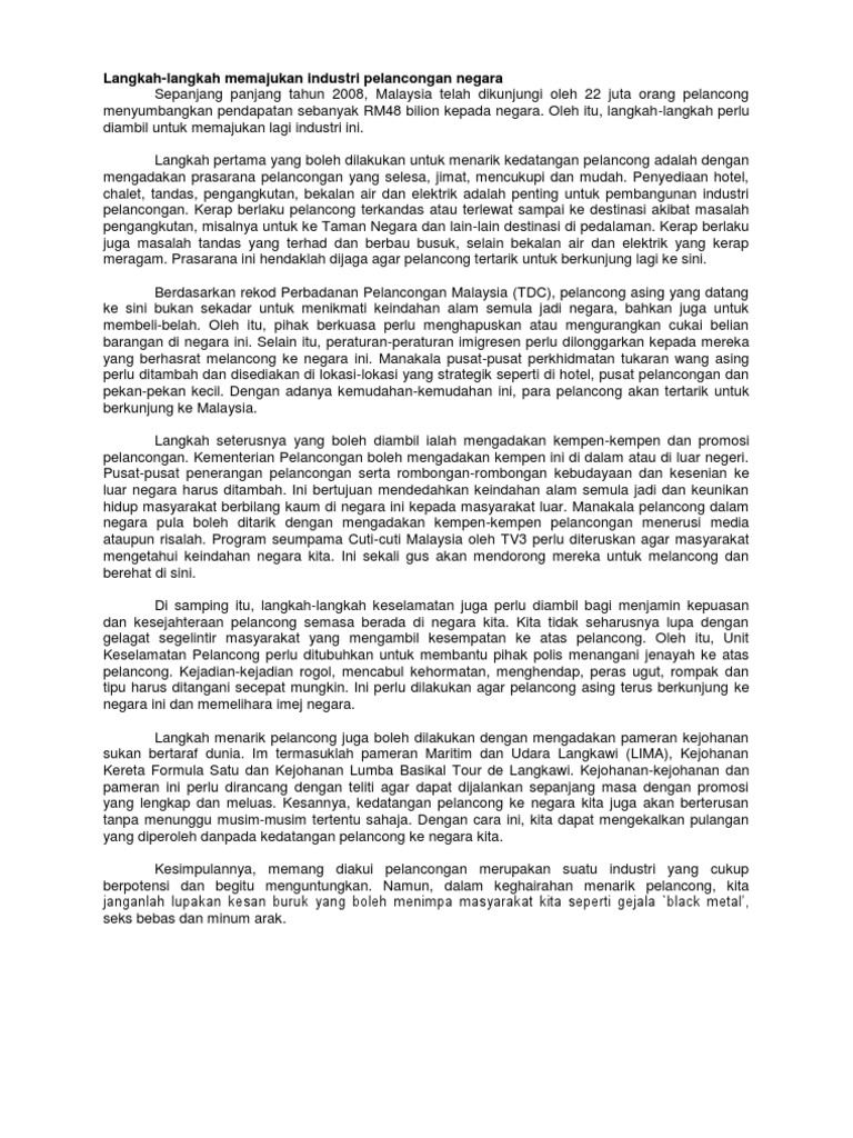 Usaha-usaha untuk memajukan sektor pelancongan di negara kita. Karangan SPM Bahagian B- Soalan 3. Pelancongan Faktor Berkembang Sektor pelancongan merupakan salah satu industri perkhidmatan terpenting di negara kita.