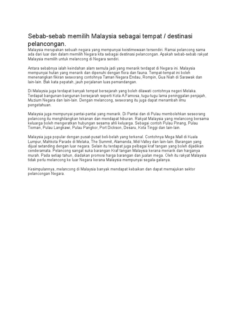 Semoga dengan perkongsian ini sedikit sebanyak dapat membantu anda dalam menghasilkan karangan yang berkualiti. Kesimpulan September 18 2016 pelancongansade1013 Industri pelancongan mempunyai banyak potensi untuk berkembang di Malaysia. Di samping itusektor pelancongan juga dapat memajukan bidang perniagaan di Malaysia.